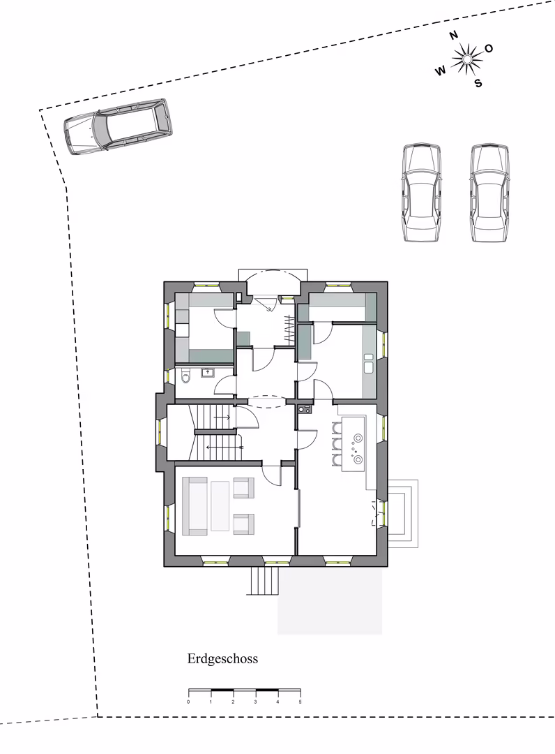 Küche, Essbereich und Wohnzimmer wurden bewusst räumlich voneinander getrennt. Dadurch entstehen eigenständige Nutzungsbereiche mit jeweils spezifischen Raumqualitäten, anstelle eines offenen, zusammengefassten Wohnraums.