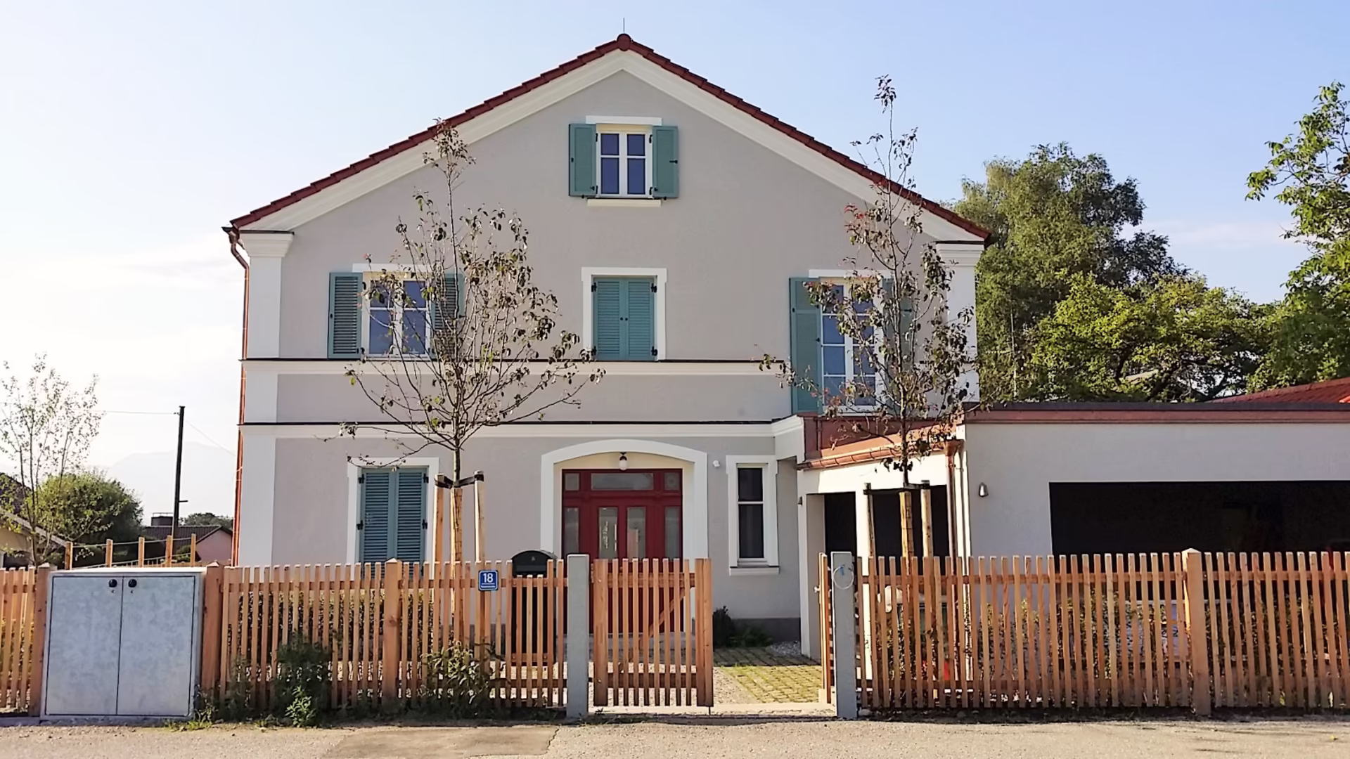 Das Haus ist klassisch proportioniert. Auf ein weit überstehendes Dach wurde auf Wunsch der Bauherren verzichtet. Stattdessen wurde ein großes Traufgesims ausgebildet, das die Fassade horizontal gliedert.