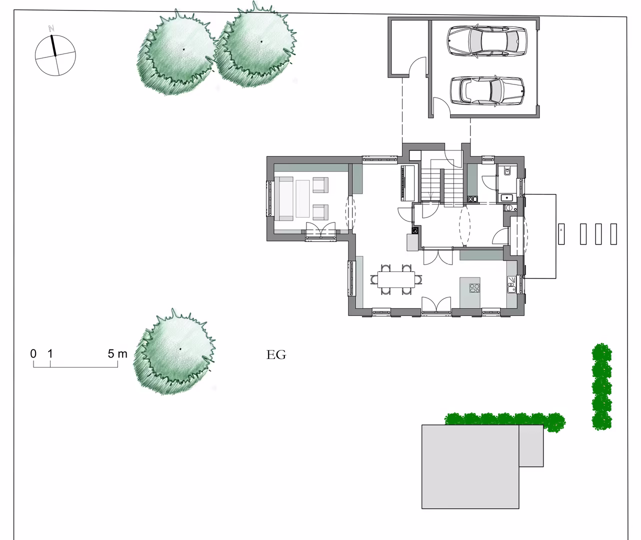 Ein kleiner Anbau am Wohnzimmer erweitert den Hauptbaukörper. Durch seine Überdachung entsteht eine wettergeschützte Außenterrasse, die den Wohnraum nach außen ergänzt, ohne die Grundform des Hauses wesentlich zu verändern.